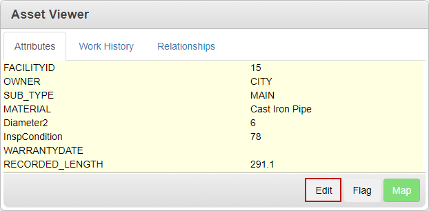 Asset attributes can be viewed or edited. Any edits made in the Asset Viewer are applied to the geodatabase.