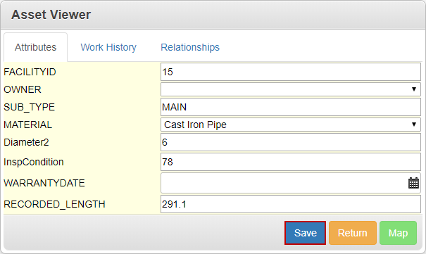 NOTE: The attributes that are displayed in the Asset Viewer and their formatting is configured in Designer under GIS > Asset Groups > Asset Form Configuration for each asset type. See Add an Asset Type in the Designer for 15.7 Guide for more information.